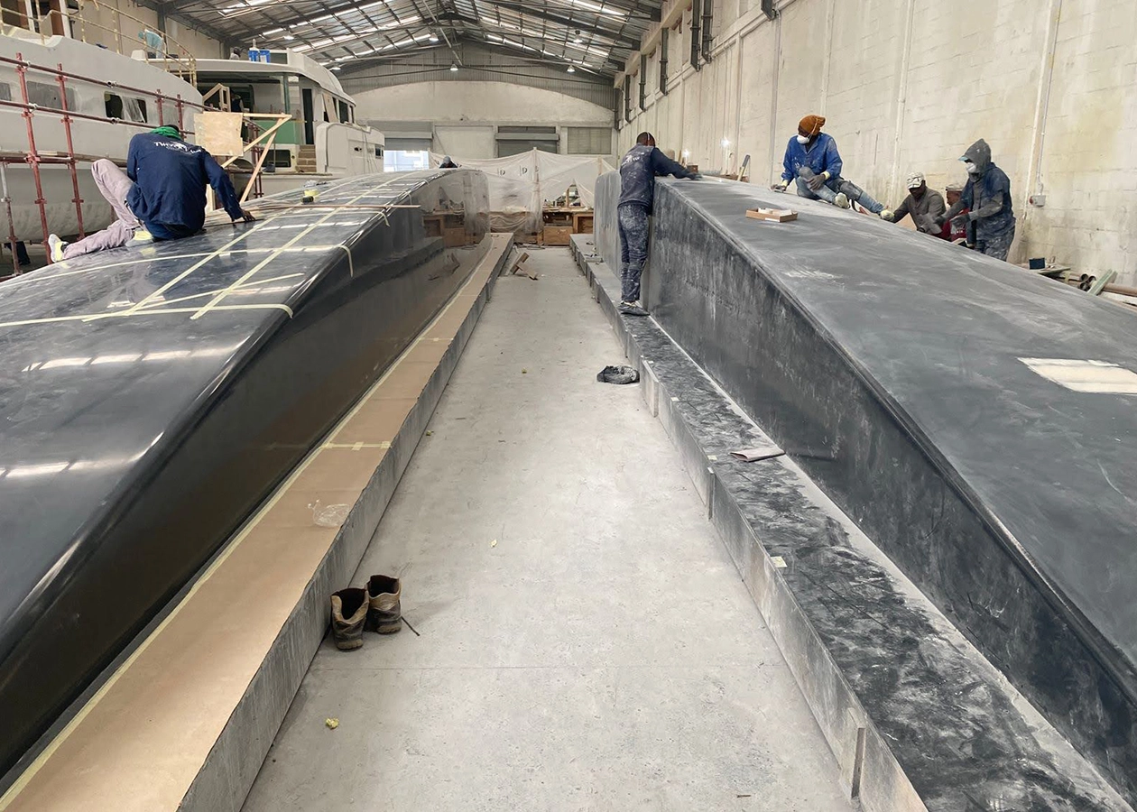 "The hull that I inspected was spray finished in a gray blue color and the fairing quality was flawless, not a single bump in her shiny blue hulls. It is hard to imagine the amount of time it took to fabricate tooling that allowed for this, or the amount of time spent fairing her to gain such a finish.” — Multihulls Magazine