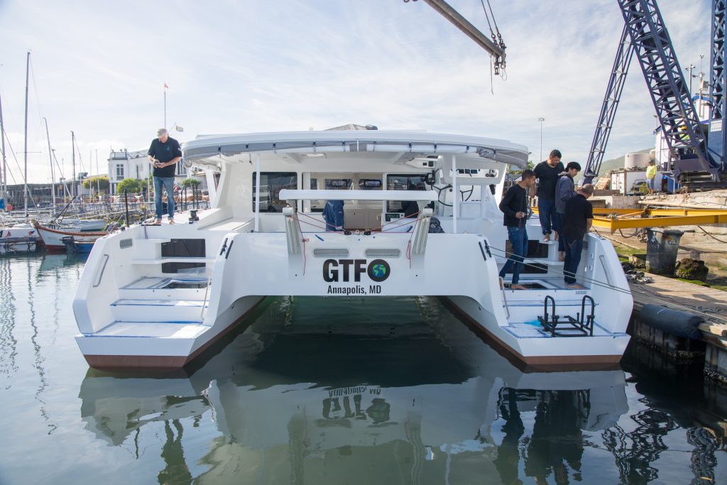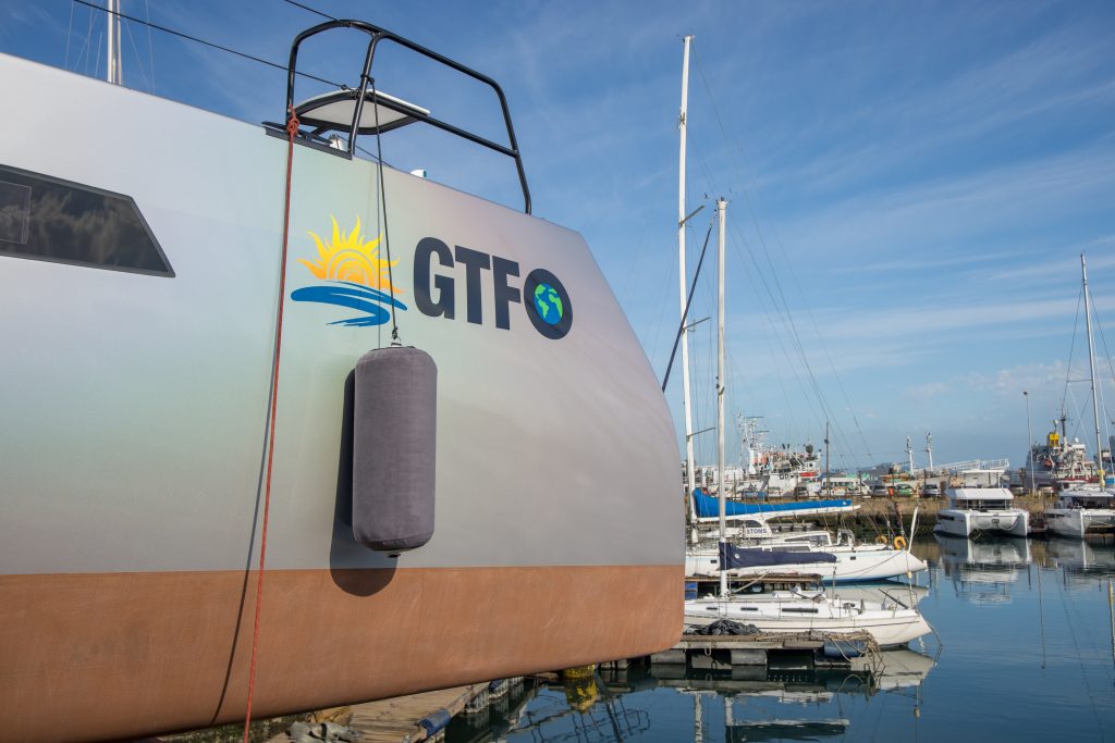 Congratulations to GTFO plan forces of nature Ann and Dennis! This beauty – wrapped with the color and graphics as part of the overall design – hit the water recently and it’s only a matter of time before the adventure begins. If you are not following GTFOplan yet on YouTube, better get ready as this dynamic duo starts on their new life very soon. As they put it, they have both worked hard and now they want to play really hard too. We wish them fun and adventure!