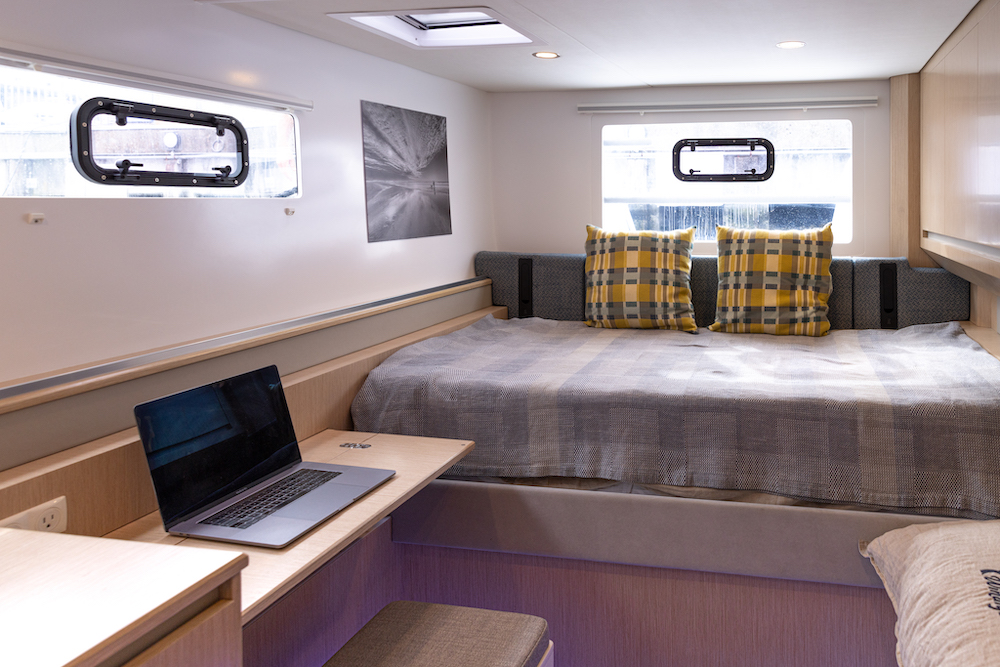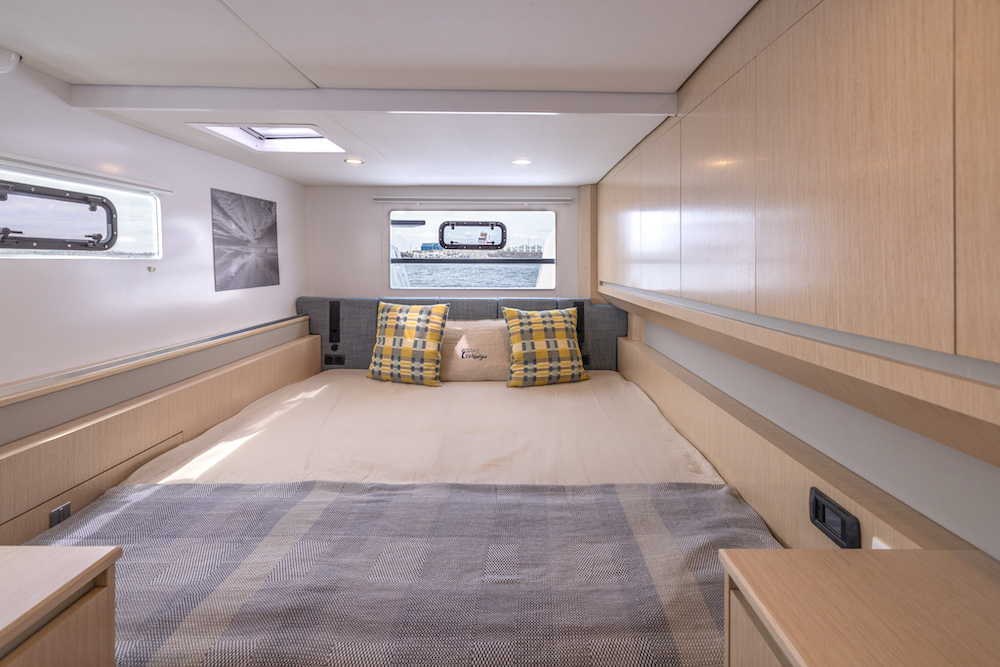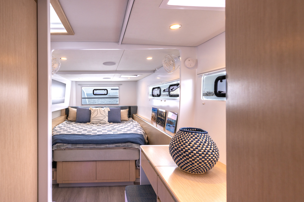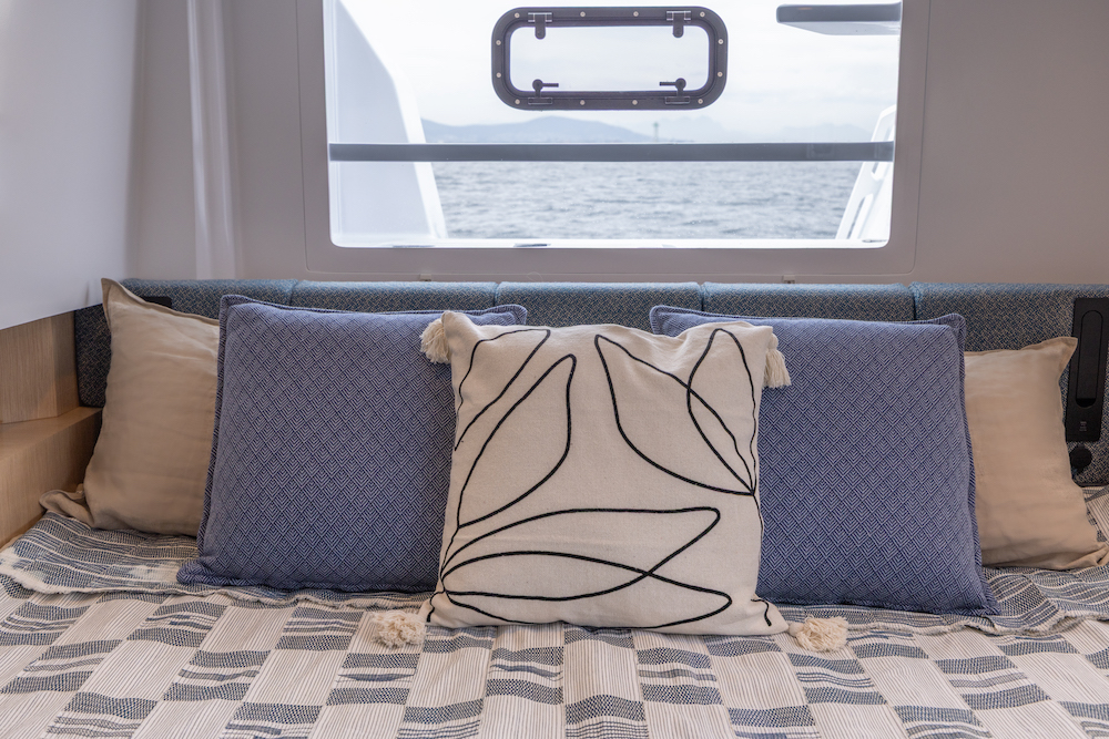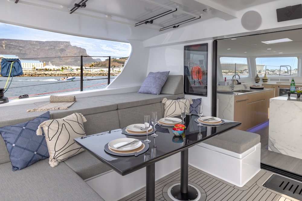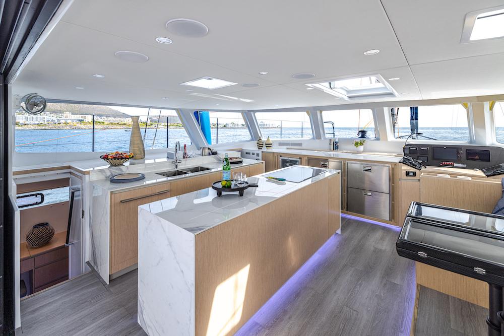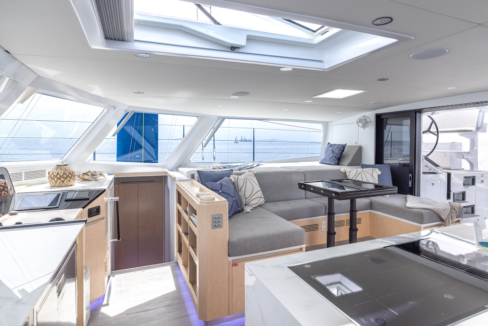 The open-plan cockpit and salon can transform with the weather—wide open on sunny days or closed off for a cozy, light-filled retreat when the skies turn.